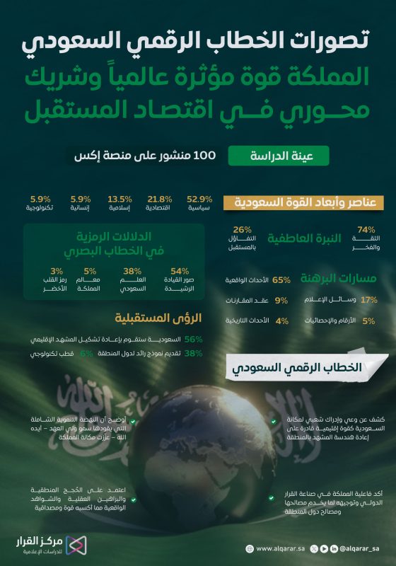 وفي هذا الإطار، تأتي أهمية الدراسة التي أجراها مركز القرار للدراسات الإعلامية، وسعت إلى استكشاف تصورات السعوديين للمملكة كقوة، والتعرف على أبعاد تلك القوة في الوعي الجمعي، وتحليل النبرة العاطفية السائدة، ورصد مسارات البرهنة والرؤى المستقبلية التي يعكسها الخطاب الرقمي السعودي. وذلك عبر تحليل عينة قوامها (100) منشور على منصة إكس.