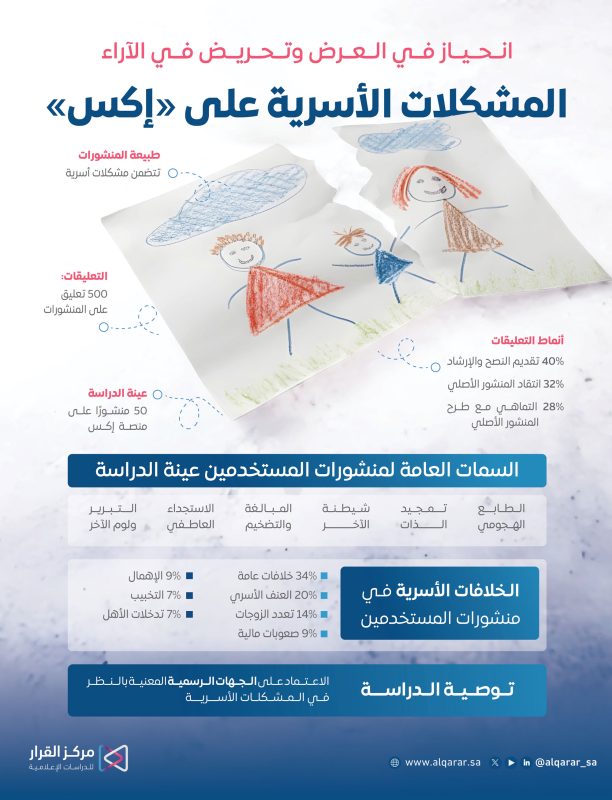 وانطلاقًا من خطورة هذا السلوك الاتصالي الذي يُهدد الاستقرار الأسري، تبرز أهمية الدراسة التي أعدها مركز القرار للدراسات الإعلامية والتي تهدف إلى رصد وتحليل عينة مكونة من (50) منشورًا على منصة إكس تتضمن مشكلات أسرية، وذلك من أجل التعرف على طبيعة تلك المنشورات وكيفية تقديمها للمشكلات. كما رصدت (500) تعليق متفاعل على المنشورات بواقع (10) تعليقات على كل منشور، للتعرف على أنماط تعاطي المستخدمين مع المشكلات الأسرية.