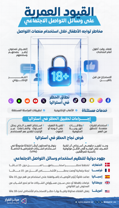 اعتبارًا من 10 ديسمبر الجاري، أصبحت منصات التواصل الاجتماعي التي تُقيّد عمر المستخدمين ملزمة باتخاذ إجراءات معقولة لمنع الأستراليين دون سن 16 عامًا من إنشاء حسابات أو الاحتفاظ بتلك الموجودة لديهم، حيث تهدف هذه القيود إلى حماية الشباب الأسترالي من الضغوط والمخاطر التي قد يتعرضون لها أثناء استخدامهم منصات التواصل الاجتماعي.