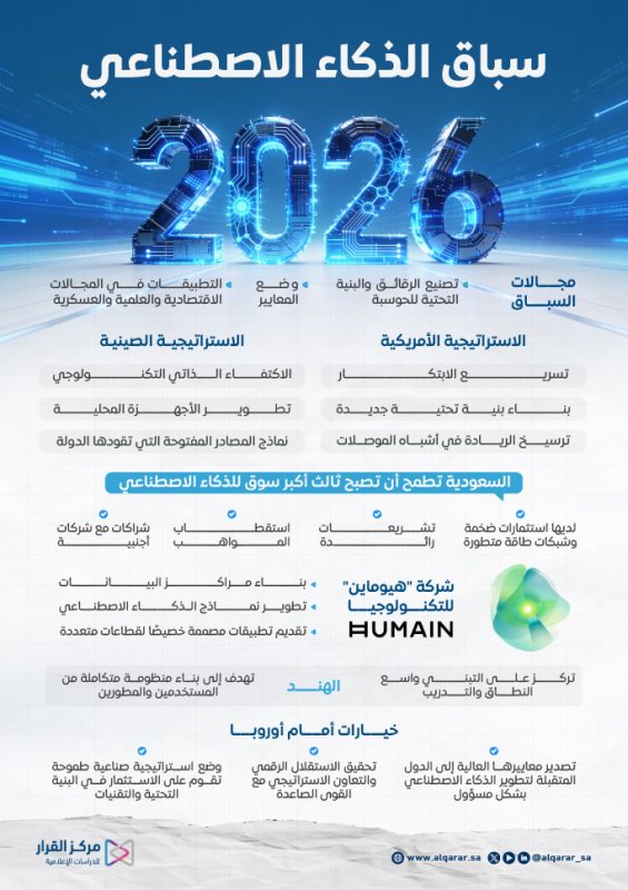تشير الدلائل إلى أن التنافس على الذكاء الاصطناعي في عام 2026 سيتجاوز مجرد سباق تكنولوجي، ليتحول إلى صراع للسيطرة على سلسلة القيمة بأكملها: من تصنيع الرقائق إلى البنية التحتية للحوسبة، ومن وضع المعايير إلى التطبيقات في المجالات الاقتصادية والعلمية والعسكرية.