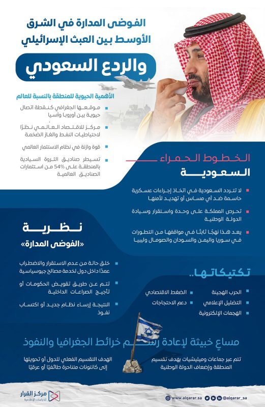 وختامًا، يمكن القول إن منطقة الشرق الأوسط تمر حاليًا بواحدة من أحلك اللحظات في تاريخها الحديث، فالمرحلة الراهنة حاسمة في مستقبلها، كثيفة في تحدياتها، في ظل مساعي بعض الأطراف لإعادة تشكيل النظام الإقليمي عبر مشروع التقسيم والتجزئة للسيطرة على ثروات ومقدرات الشعوب والتحكم في الممرات الاستراتيجية. وتبقي السعودية بحكمة قيادتها الرشيدة وحسمها وحزمها رادع أمام تلك المخططات الخبيثة التي انتقلت من دروب الخفاء إلى ساحات الواقع على امتداد الخارطة في الإقليم.